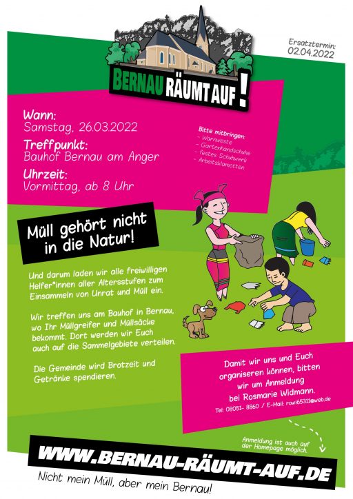 Bernau räumt auf / Ramadama 2025 Am Samstag, den 05.04.2025 veranstalten wir wieder den jährlichen gemeinsamen Cleanup. Wir treffen uns ab 8 Uhr am Bauhof, bis 9 Uhr könnt ihr dort euer Startpaket inkl. Gebietseinteilung abholen. Bis 12 Uhr werden wir Bernau aufräumen und damit auch wieder zeigen, dass Müll nicht in die Natur gehört.…